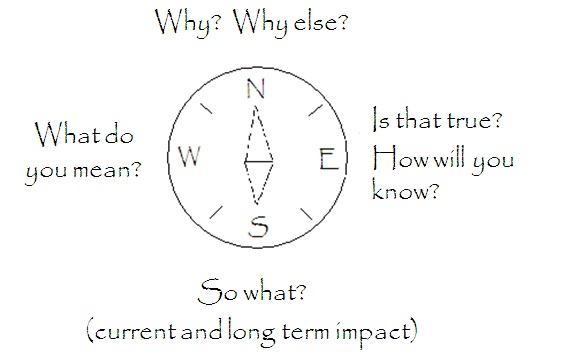 My first question is generally “what is the project about?” But that generally leads to a vague answer. So I use my “question compass”: