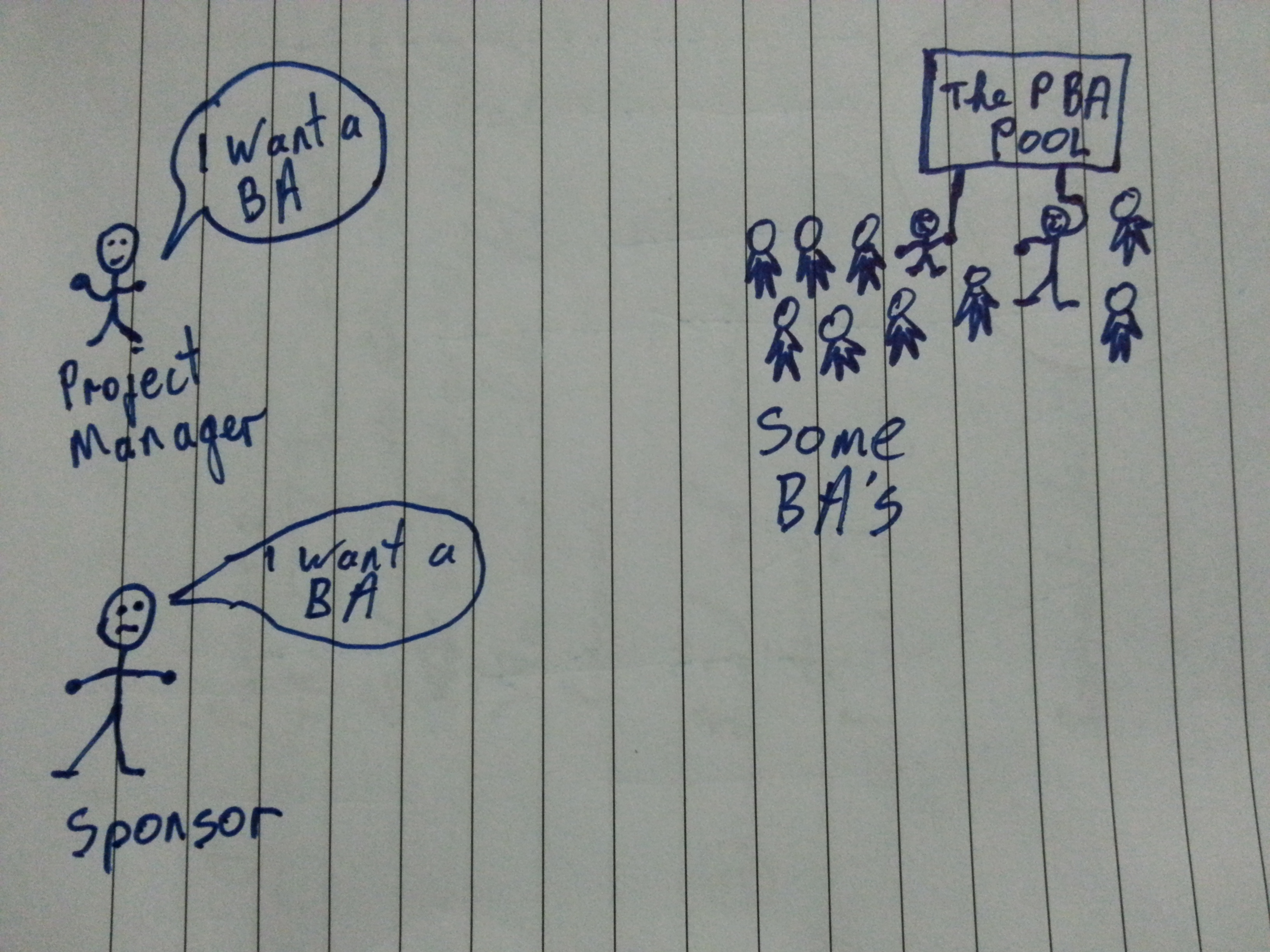 The team is called the “project BA pool” or PBA and is focussed on putting BA’s into projects. Unfortunately some project managers bring in their own contractors and there are some other teams that sometimes put “BA” type people onto projects. People in the team are starting to ask the manager if they should just become contractors and find their own work and the manager is telling them to stick with the team as there will be great opportunities ahead.