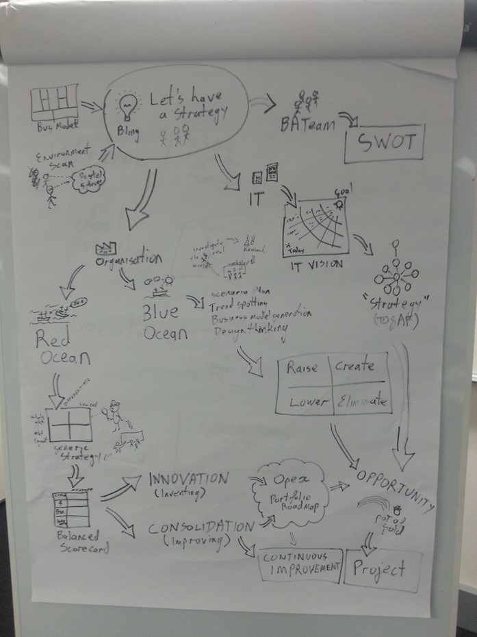 Each of these roles contain a core element of “BA” stuff – whether you call it business analysis or business architecture. But typically BA’s do not look at marketing strategy, financial viability of the organisation or deep customer research and understanding. They BA takes over from these people and helps you go from “understanding the market and our finances” to “let’s do a project – or at least a business case”.