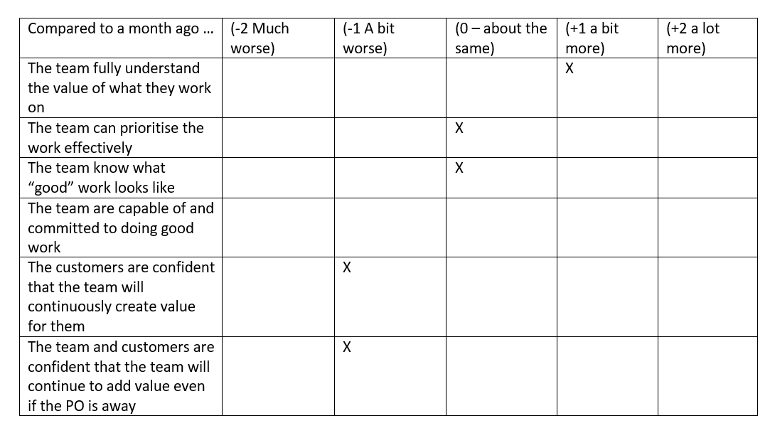 OK – the first metric for a good PO is to measure the clarity of the goal and the commitment of the team to achieving it.