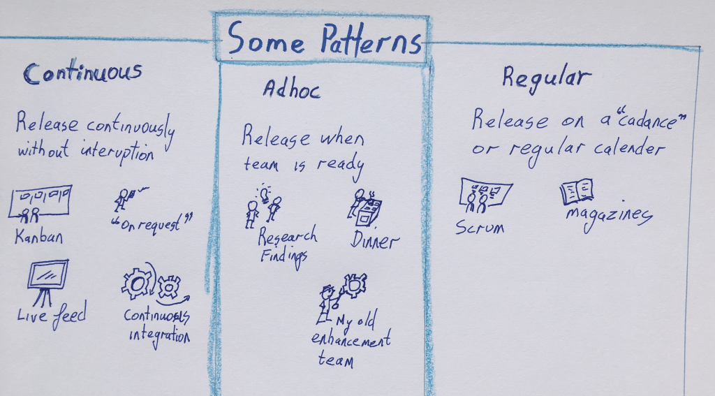 If you are doing continual releases then you can either release on an adhoc basis (whenever something is ready) or you can set up a regular rhythm, where a batch of things are released together. For example an online (or paper based) magazine might publish an edition every Thursday, including multiple articles, opinion pieces, advertisements etc). In this case the release probably involves a little more drama, but the cadence, or rhythm is designed to give a regular flow to the work.