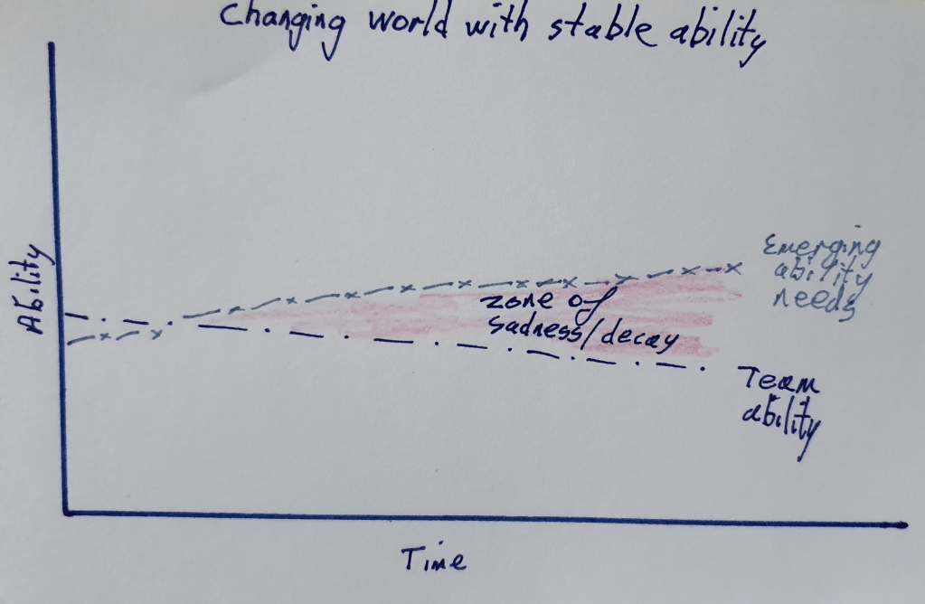 In a changing world, if the team’s skills stay the same while the world is continually changing, then their skills are gradually becoming less relevant and this decreasing relevance has a large impact over time.
