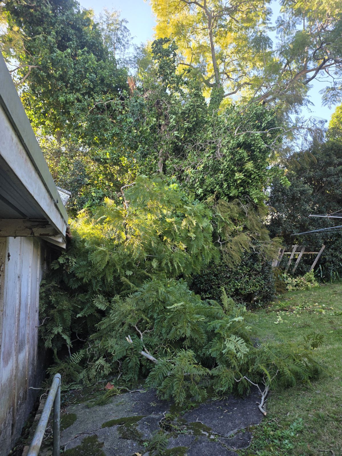 - At home, my neighbour’s tree fell into my backyard. It caused very little damage but left dangling (gigantic) branches that could cause damage. It also left a huge mess to be cleaned up.